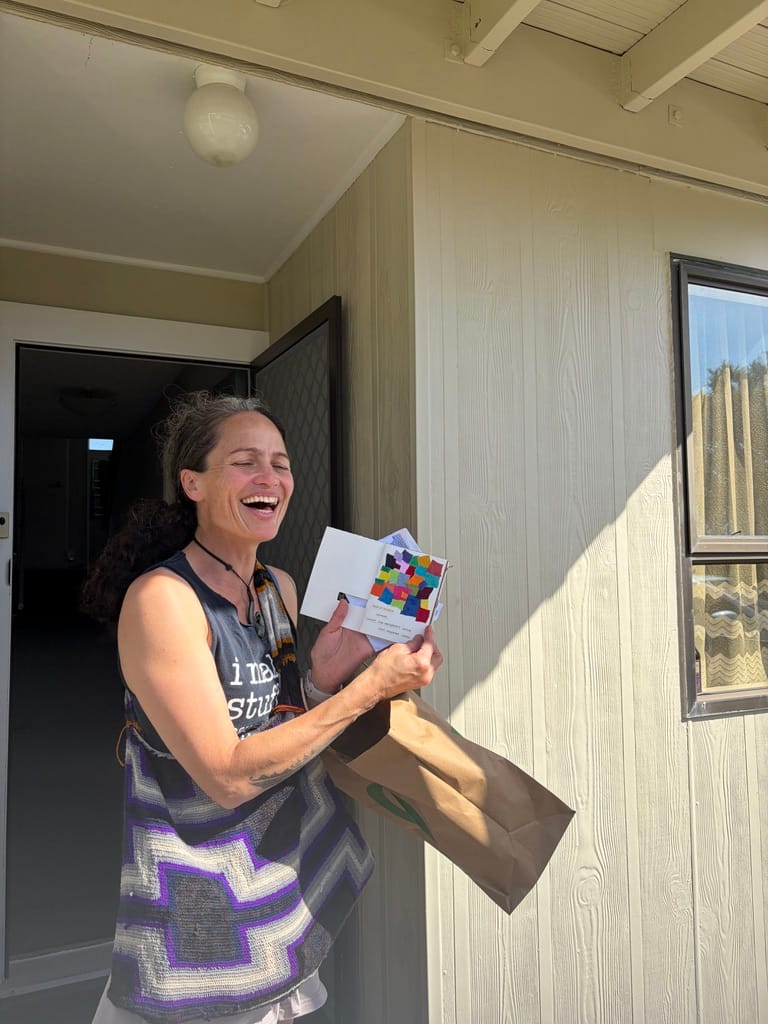 Aahhhhhhh!! My heart sings. Two of the chain zines have arrived back with me - thank you for the updates people sent as you received and passed them on. I have faith that they will all show up in time. Here's me and my stupid face when the first one arrived back the DAY BEFORE I moved out of my old whare: