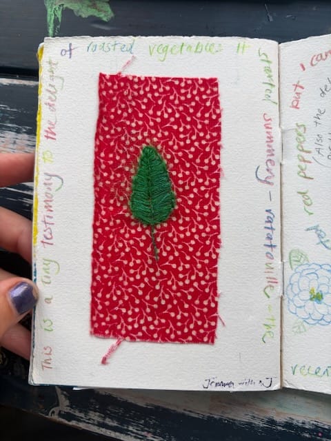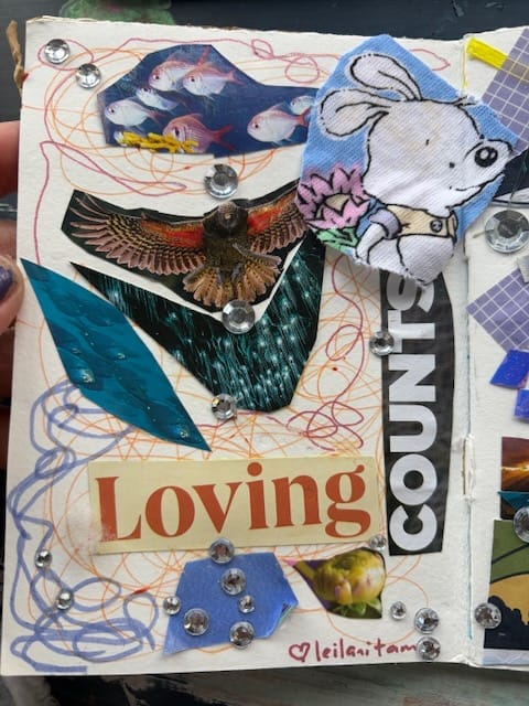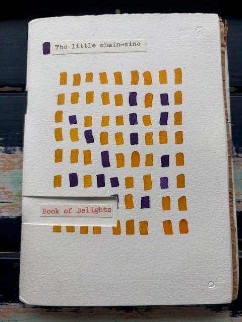 The Book of Delights - chain zine with contributions including colourful collage, stitching, jewels, and words....