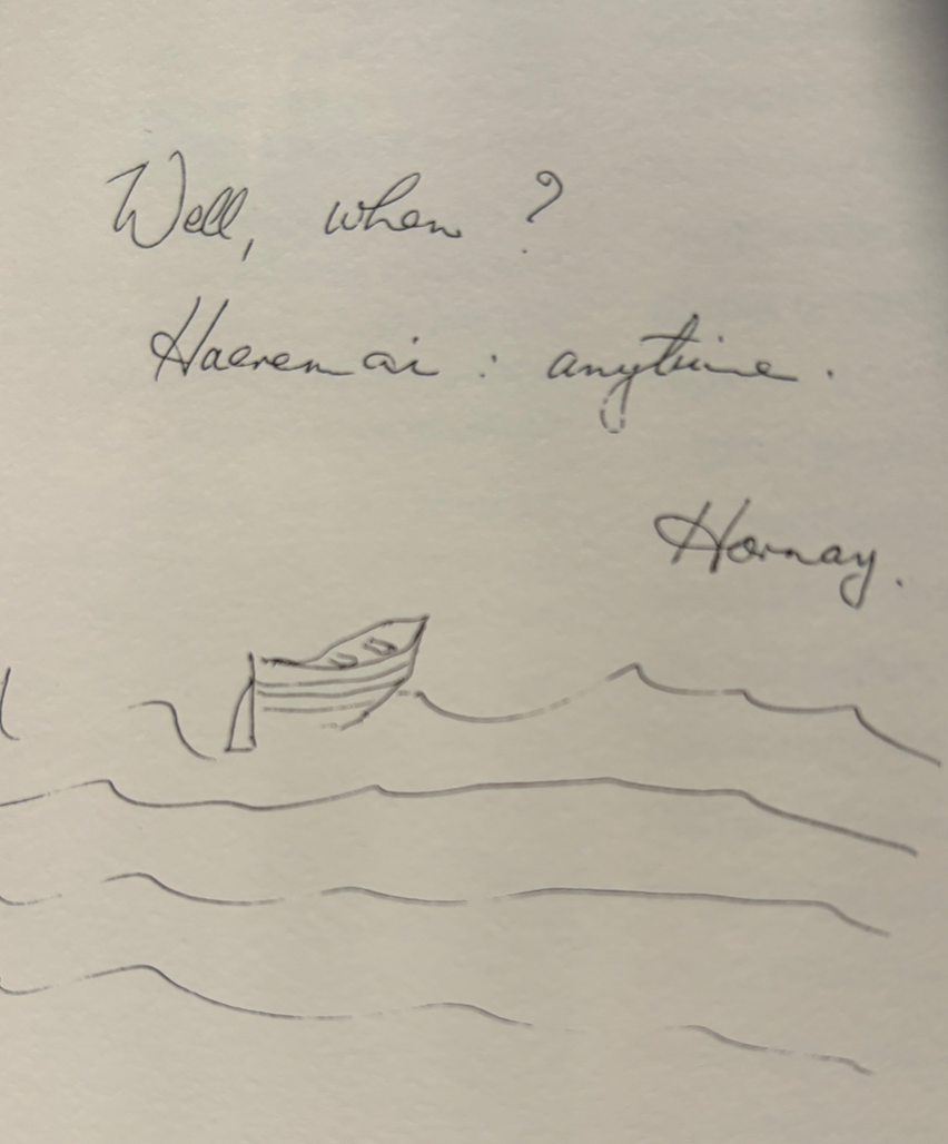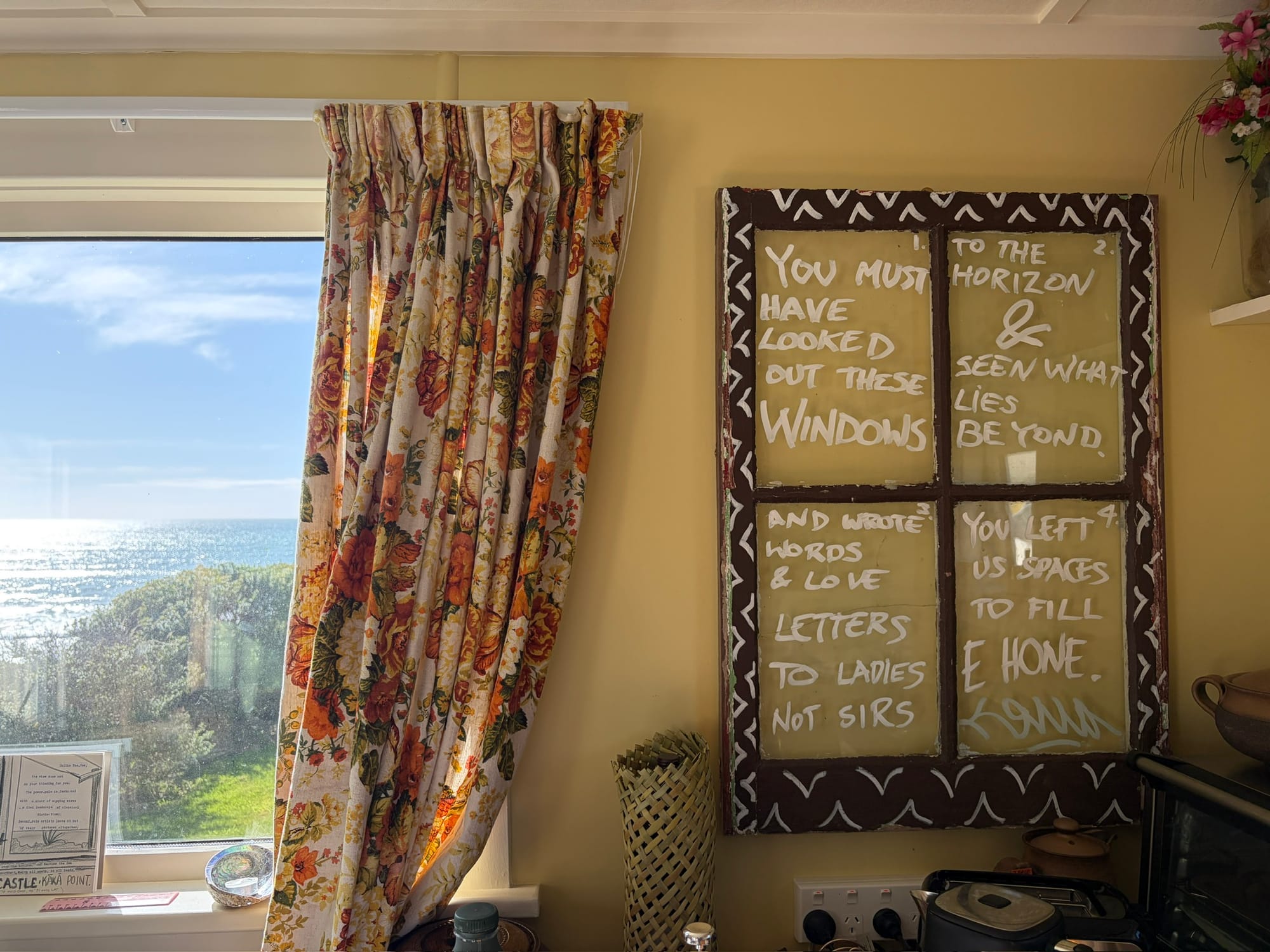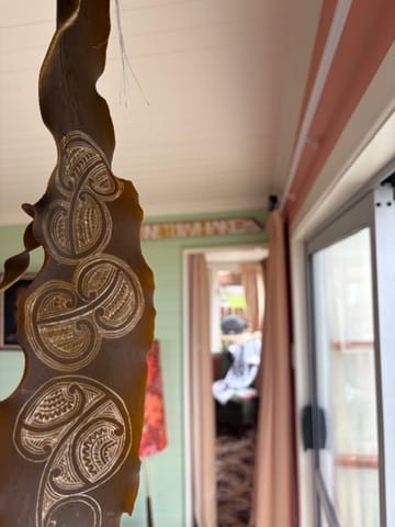 My own writing has been a bit stop-start. The jitters, Haimana said. Fair enough. When I flung back the ranch slider door and saw Hone's delighted face beaming down at me I just froze. Thinking: is this real? It took me ages to step across the threshold. Eyes going in all directions, to all the treasures glinting on every shelf and wall, sketches and scratchings on kelp and windowpane, each one brought and laid by previous manuhiri and not one identified by name - but you can take a punt, every ringatoi has their own signature and style and lovely uniqueness. Same as Hone. Singular. Imitating no-one.