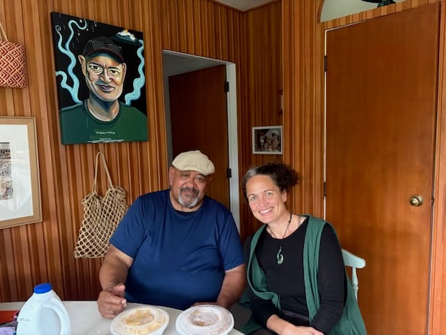 Left: Pāpā John and me having a cuppa with painting of Darren by the uber talented Tina Walker-Ferguson behind us. Right: enough kai to feed us all the way to next week.