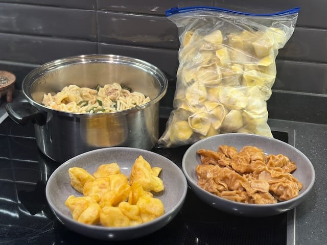 The next day, I found John's place easily, and took over some free range eggs and a bag of lemons and a copy of this story. The same afternoon, he filled up his walker with kai like it was a station wagon and pushed it over to mine. There was a pot of hand-made wonton noodle soup with spinach, fried prawn wantons, sweet and sour pork wontons, and a gigantic bag of frozen wontons for the freezer. He sat with me and Mum and had a cuppa, while Darren grinned down at us from the wall.