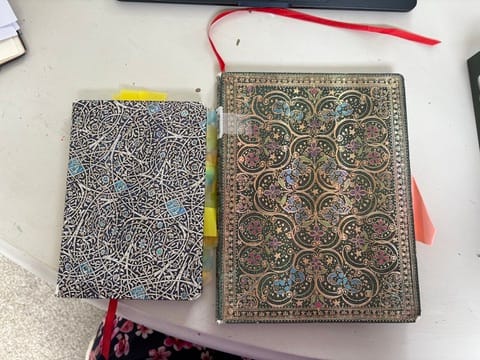 I have one small journal that goes everywhere with me, and a bigger one that I use for longer entries in the morning. My preference is the Paperblanks because they're uniform in size but have different covers which I like because I like variety.